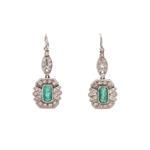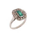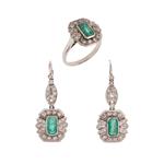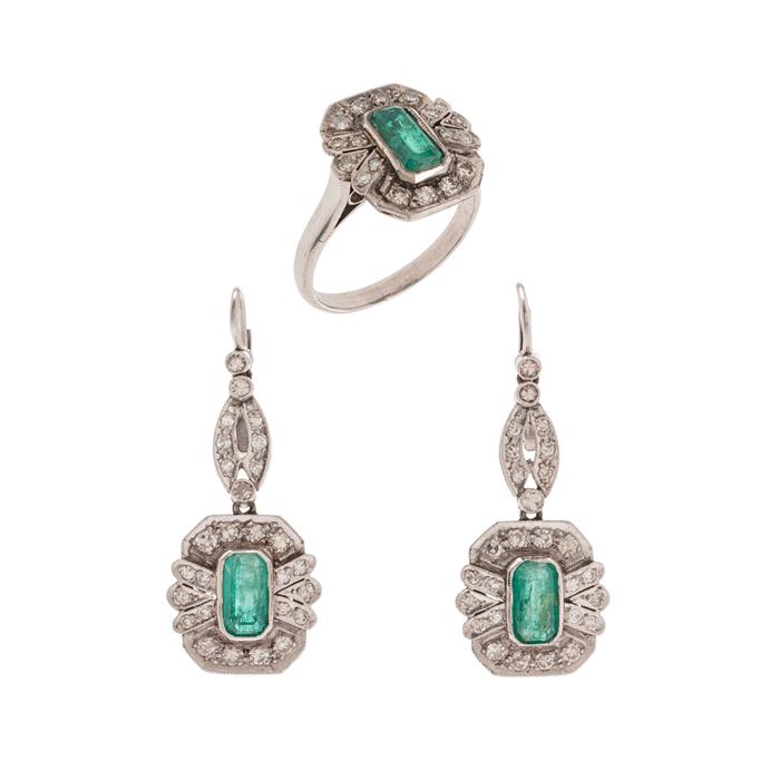 Anillo y par de aretes con esmeraldas y diamantes en plata paladio.