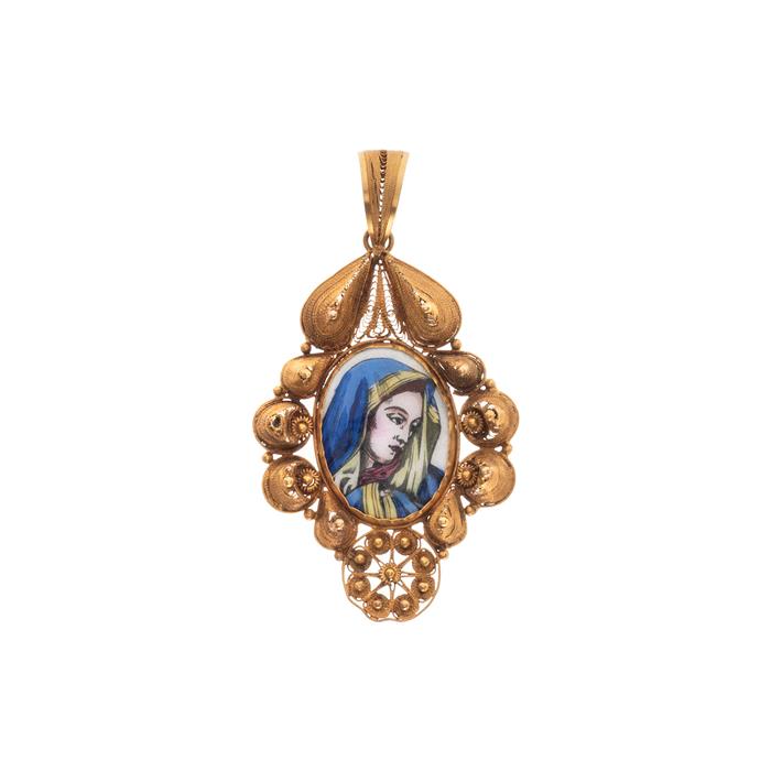 Subasta 1248T, Lote # 342 Medalla de filigrana en oro amarillo de 8k con miniatura pintada a mano. Peso: 6.5 g. Estimado $3,800-4,500