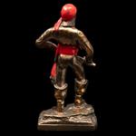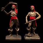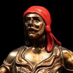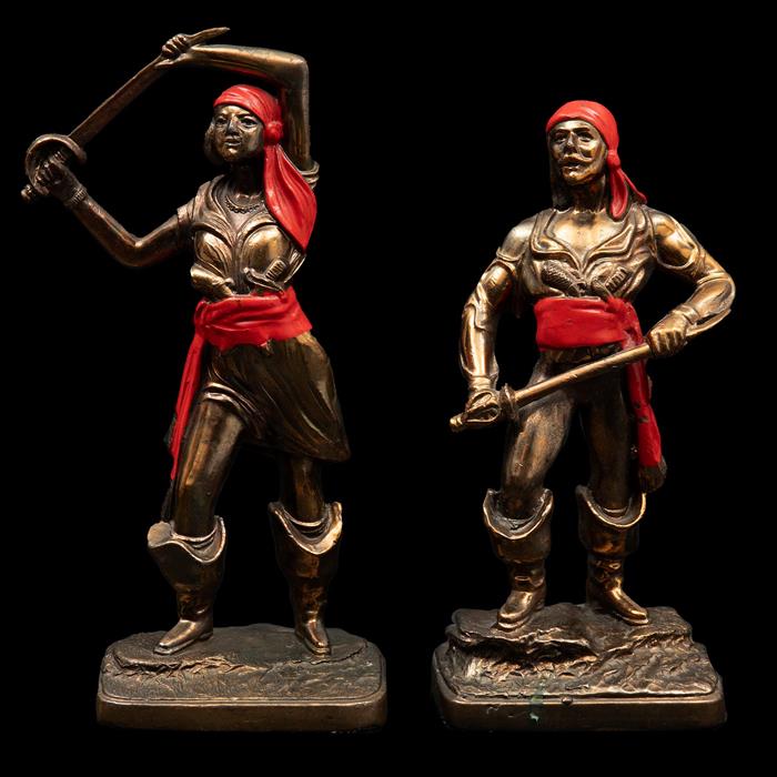Metal, acabado dorado y detallados en color rojo; figuras a manera de piratas