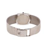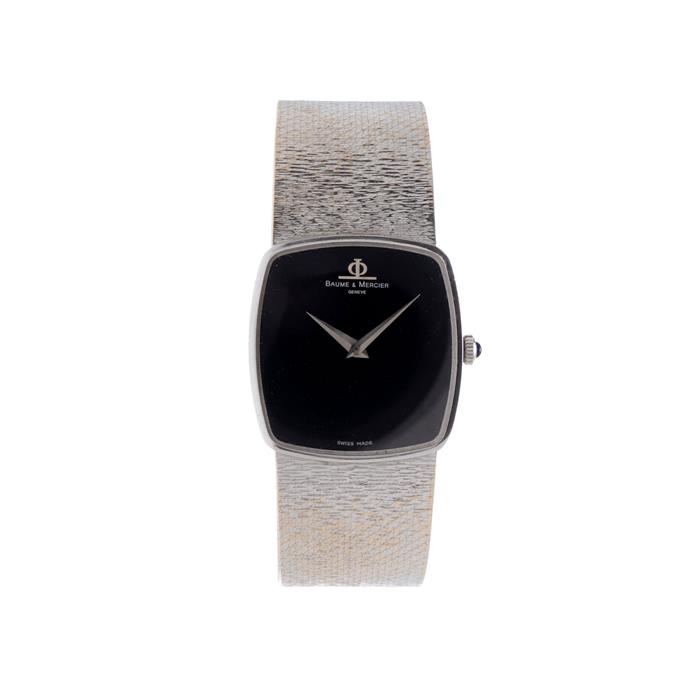 Reloj Baume & Mercien. Movimiento de cuerda manual Calibre 1050. Caja cuadrada en oro blanco. Carátula en color negro. Pulso acabado corteza en oro blanco de 18k. Estimado $45,000-60,000