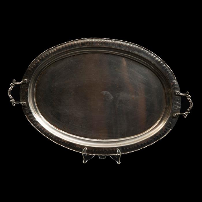 CHAROLA DE SERVICIO SIGLO XX Metal plateado; forma oval, borde aperlado, asas con relieves de acantos Ligeros detalles de conservación 40 x 62 cm Estimado $800-2,000