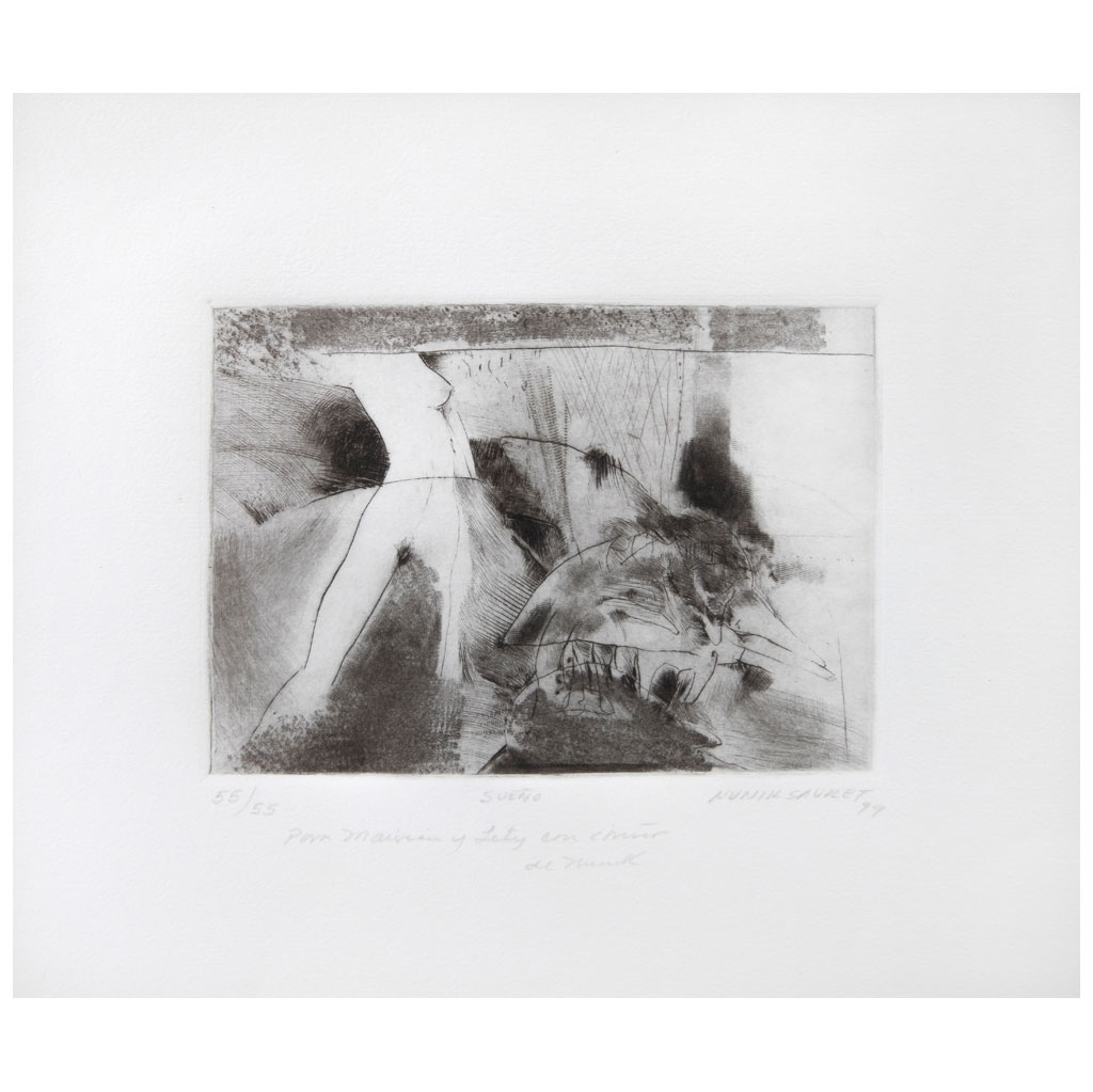 NUNIK SAURET (Ciudad de México, 1951 - ) Sueño Firmado y fechado 99 Grabado al aguafuerte y aguatinta 55 / 55 Con dedicatoria. 12 x 17 cm medidas de la imagen 24 x 29 cm medidas del papel Estimado $4,000-8,000