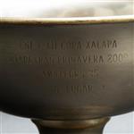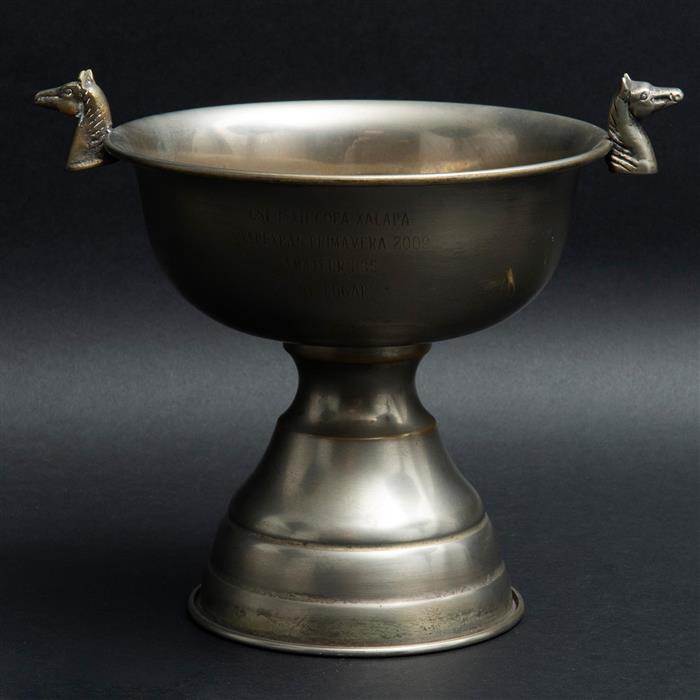 Metal plateado; diseño a manera de copón, base circular escalonada, asas en forma de cabezas de caballo y la leyenda: "CSI 3 XII COPA XALAPA COAPEXPAN PRIMAVERA 2009 AMATEUR 1.35 3er LUGAR"