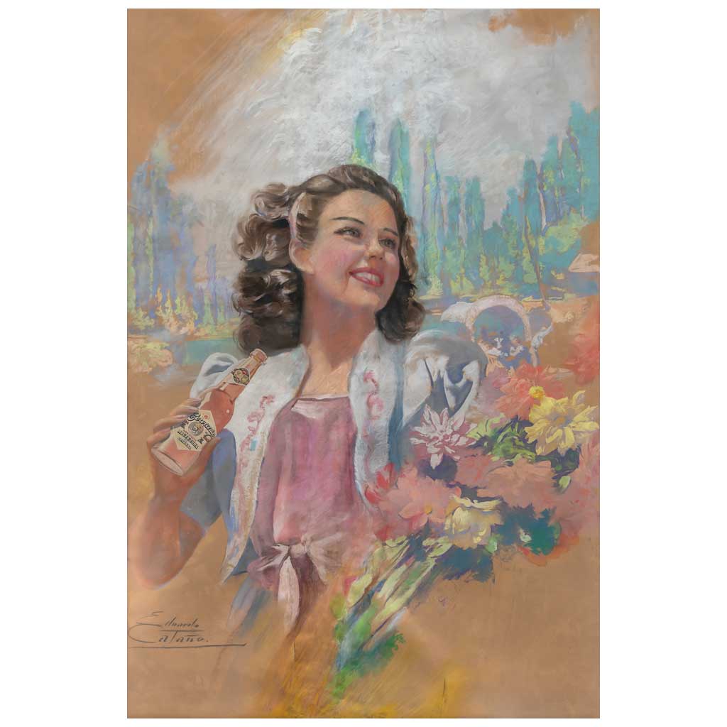 EDUARDO CATAÑO (Nayarit, México, 1910 - Ciudad de México, 1964) Mujer en Xochimilco con cerveza Moctezuma Firmado Pastel y collage sobre papel Presenta detalles de conservación y perforación. 137 x 97.5 cm Estimado $35,000-100,000