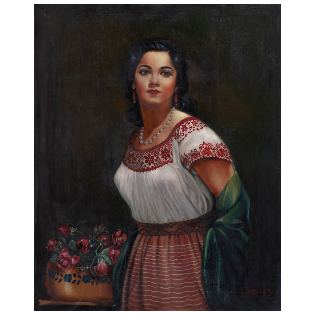 Subasta 1204, Lote # 136 PANDURO M. (México) Mujer con rosas Firmado Óleo sobre tela Presenta detalles de conservación. 100 x 80.5 cm Estimado $36,000-50,000