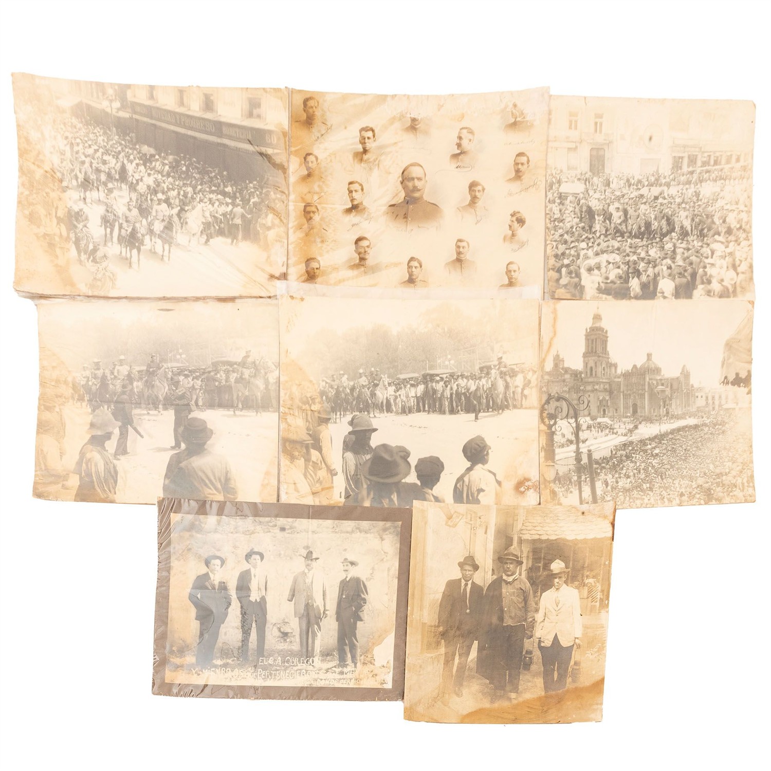 8 Fotografías, varios formatos, 46.5 x 59.5; 46.5 x 49.5 cm. Montadas sobre cartón. Algunas con pequeños faltantes, y daños por humedad.