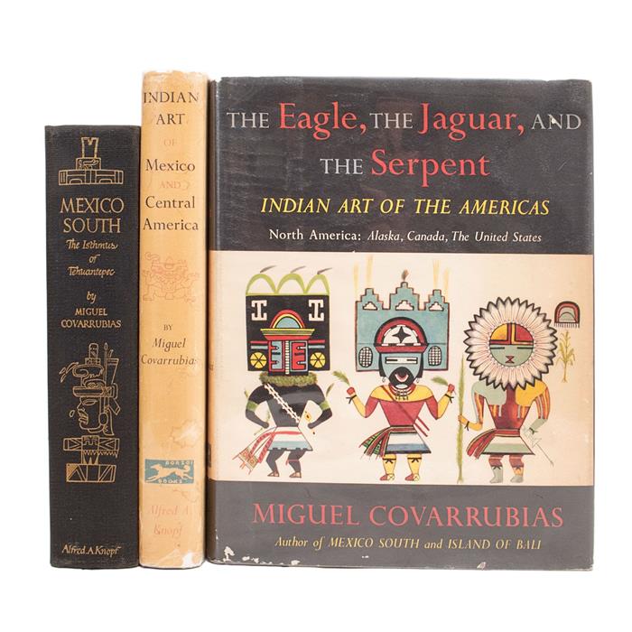 Subasta 1297T, Lote # 17 COVARRUBIAS, MIGUEL. MEXICO SOUTH / THE EAGLE, THE JAGUAR, AND THE SERPENT / INDIAN ART OF MEXICO & CENTRAL AMERICA. NEW YORK: 1946, 1954 Y 1957. a) Mexico South the Isthmus of Tehuantepec. New York: Alfred A, Knopf, 1946. 4o. marquilla, XXVIII + 427 p. + 4 h. + VIII p. Paintings and drawings by the author. Photographs by Rose Covarrubias, the author, and others. First edition. Un mapa, plegado, y laminas en color, ilustraciones intercaladas y un "Album of Photographs" con fotografías en negro. Sin cubierta. Encuadernado en pasta dura. b) The Eagle, the Jaguar, and the Serpent. Indian Art of the Americas. North America: Alaska, Canada, the United States. New York: Alfred A, Knopf, 1954. 4o. marquilla, VIII + 314 + XI p. First edition. Laminas en color, ilustraciones intercaladas y "An Album of Photographs" (XLVIII plates) fotografías en negro. Encuadernado en pasta dura. c) Indian Art of Mexico & Central America. New York: Alfred A, Knopf, 1957. 4o. marquilla, XVI + 360 + XVII p. Colo plates and drawings by the author. First edition. Laminas en color, ilustraciones intercaladas y "An Album of Photographs" (LXIV plates) fotografías en negro. Encuadernado en pasta dura. Total de piezas: 3. Estimado $3,500-5,000