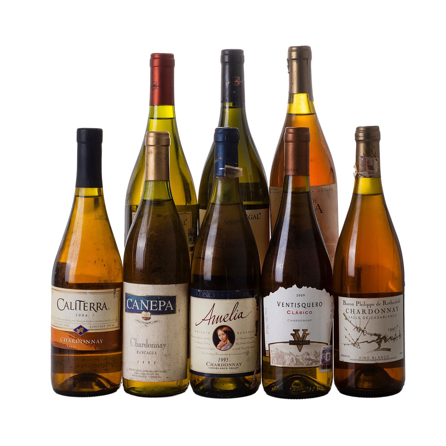 Chardonnay de Chile: a)Del Pedregal Reserva Privada. 2008. Valle de Loncomilla, Chile. b)Del Pedregal Reserve. 2007. Valle de Loncomilla, Chile. c)Caliterra. 2004. Valle Central, Chile. d)Ventisquero Clasico. 2009. Valle Central, Chile. e)Castillo de Molina Reserva. 1997. Lontué, Chile. f)Canepa. 1995. Rancagua. Chile. g)Amelia. 1995. Valle de Casablanca, Chile. Baron Philippe de Rothschild. 1997. Valle de Casablanca, Chile Total de piezas: 8 Estimado $1,300-2,200