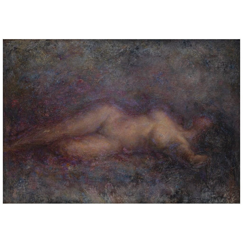 LUCINDA URRUSTI (Melilla, España, 1929 - Ciudad de México, 2023) Desnudo horizontal Firmado Óleo sobre tela sobre masonite Con etiqueta de Plástica de México Galería de Arte.