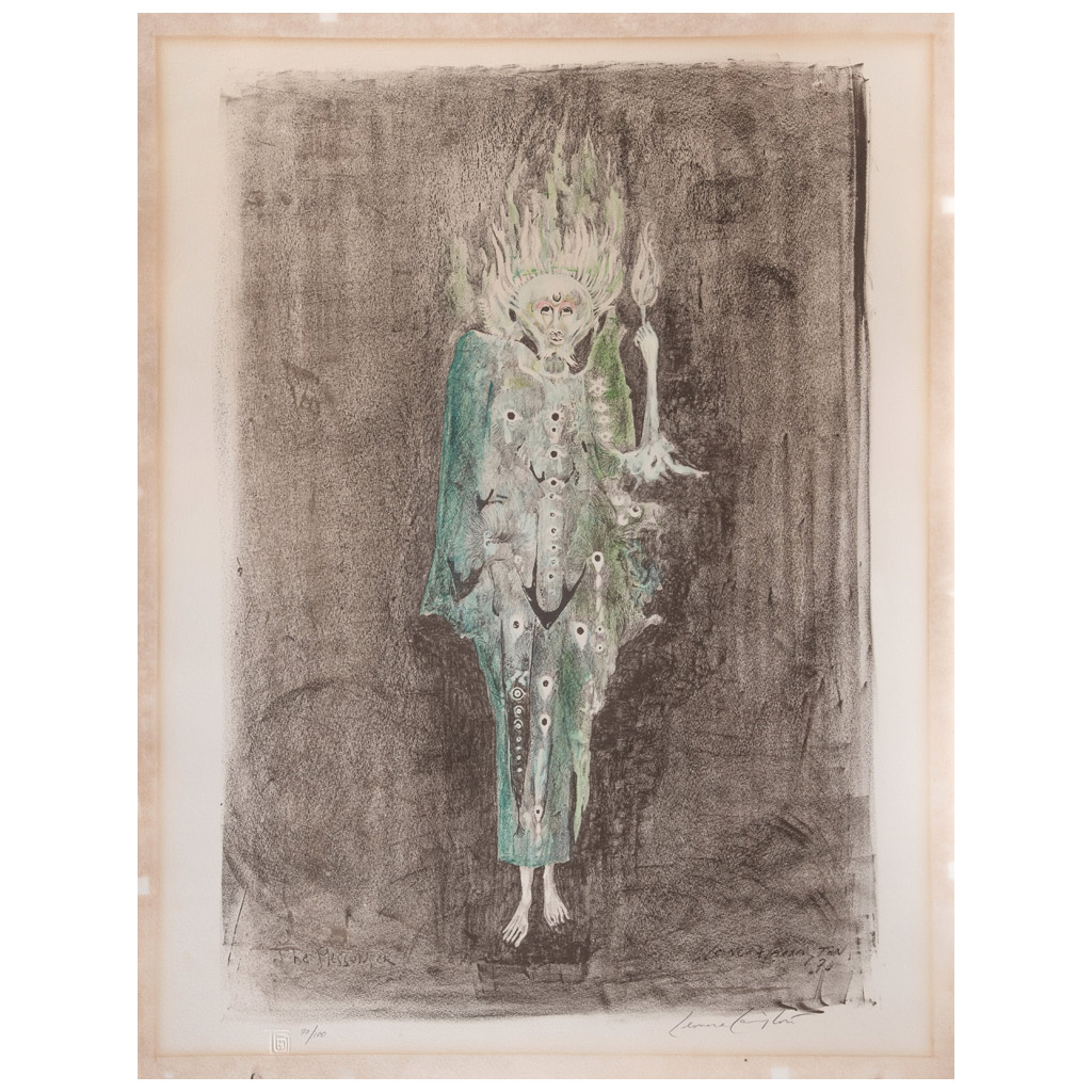 LEONORA CARRINGTON (Lancashire, Inglaterra, 1917 - Ciudad de México, 2011) The messenger (El mensajero), de la carpeta The Dybbuk, 1974 Firmada a lápiz. Firmada y fechada 1973 en plancha Litografía 70 / 100 Con sello de agua del Taller de la Gráfica Mexicana. Impresa por Taller de la Gráfica Mexicana. Pertenece a la carpeta de 11 litografías "The Dybbuk" que fue editada a partir de los vestuarios que Leonora Carrington diseñó en 1973 para la puesta en escena homónima presentada en Nueva York. "The Dybbuk" fue escrita por el bielorruso S. Ansky en 1914 y es considerada una de las obras indispensables para entender la historia del teatro judío. "The Dybbuk" es la historia de Leah'le y Hannan, una historia de amor, posesión y exorcismo. La palabra dybbuk se refiere al alma errante de un muerto, capaz de poseer el cuerpo de una persona y controlar sus acciones. Presenta detalles de conservación en el papel. Copyright Estate of Leonora Carrington / ARS.