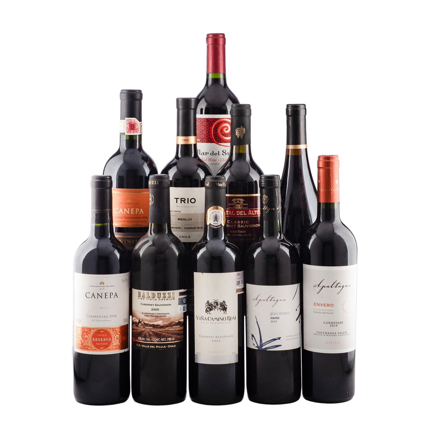 Subasta 1297T, Lote # 34 Vinos de Chile: a) Apaltagua Envero Gran reserva 2010 Valle de Colchahua, Chile b) Apaltagua Gran verano Merlot 2012 Valle Central, Chile c) Mar del Sur 2008 Chile. d) Balucci, Cabernet Sauvignon 2005 Valle del Maule, Chile e) Concha y toro, trio Blend tinto 2006 Valle de Rapel, Chile f) Finisimo Canepa, Cabernet sauvignon 2008 Colchahua, Chile g) Finisimo Canepa Reserva, Carmenere 2008 Valle del Rapel, Chile h) Partitura. Pinot Noir 2010 Maule, Chile i) Viña Camino Real Reserva. Cabernet Sauvignon 2006 Valle de Cachapual, Chile j) Portal del Alto, Cabernet Sauvignon 2005 Valle Central. Chile Total de piezas: 10 Estimado $1,300-2,000