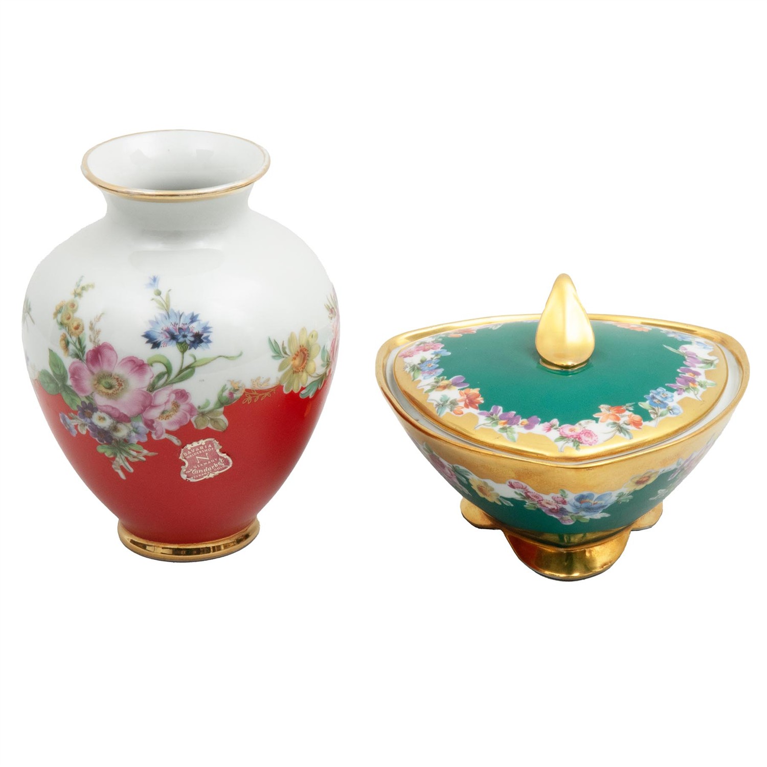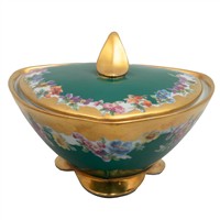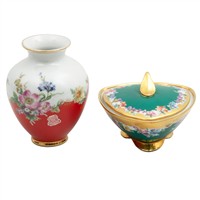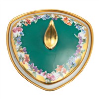 Decoración floral y esmalte dorado sobre fondo rojo y verde