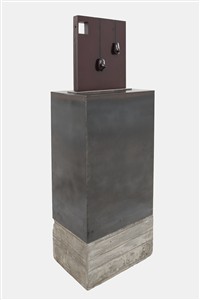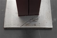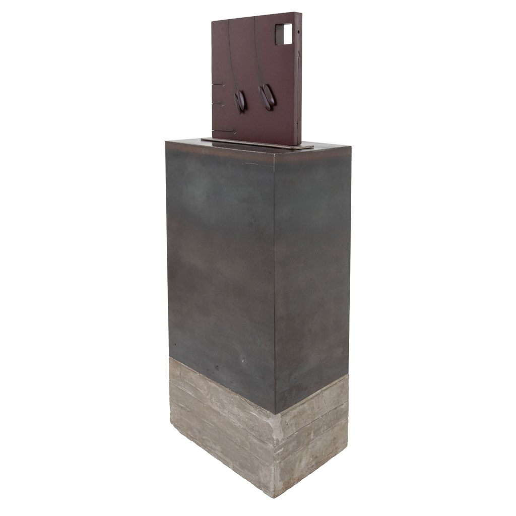 Subasta 1204, Lote # 163 RIVELINO MORENO (San José de Gracia, Jalisco, 1973 - ) Contrapesos IV Firmada y fechada 12 Escultura en acero al carbón sin número de tiraje con base de metal y concreto Con certificado de autenticidad del artista. Presenta ligeros detalles de conservación. José Rivelino Moreno es un destacado dibujante, pintor y escultor jalisciense activo profesionalmente desde los años 90 y cuya obra se ha desarrollado a través de una propuesta artística que le permite la exploración de diversos elementos para espacios urbanos. A pesar de tener una formación autodidacta, ha creado un estilo tan propio e inconfundible que convirtió a los materiales parte de su ser; con el tiempo, desarrolló la habilidad de detonar diálogos entre materiales y objetos geométricos, manteniendo la importancia del relieve a través de volúmenes realizados por intervenciones directas en las superficies. Además de su actividad artística, se ha interesado en proyectos de arte público y gestión cultural, destacando en 2009 el proyecto "Nuestros Silencios", el cual se presentó en Portugal, España, Rusia, Italia, Alemania, Francia, Bélgica, Reino Unido y México, muestra que fue el parteaguas para que obtuviera presencia internacional. Actualmente su repertorio abarca más de 60 muestras colectivas y 35 individuales en galerías y museos de México y el extranjero. Fuente consultada: sitio oficial del artista www.rivelino.com.mx 135 x 48 x 33 medidas totales con base Estimado $70,000-90,000