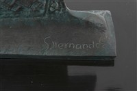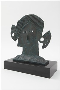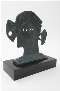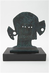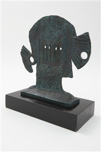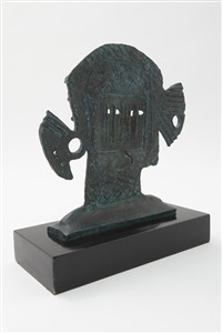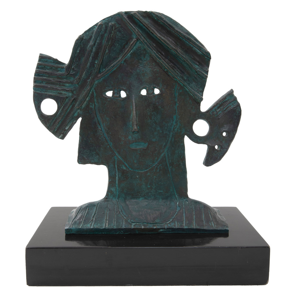 Subasta 1204, Lote # 157 SERGIO HERNÁNDEZ (Huajuapan de León, Oaxaca, 1957 - ) Eva Firmada Escultura en bronce sin número de tiraje en base de madera Procedencia: adquirido en Galería OMR. Otra versión de esta obra participó en la muestra "Sergio Hernández: La Fiesta" en la Galería OMR, en la Ciudad de México en 1985 y está publicada en el catálogo de dicha exhibición, pág. 5. El trabajo escultórico de Sergio Hernández posee cualidades visuales que provocan la sensación de inmediatez, la aspereza en lugar de acabados finos y lisos pueden aparentar poca planeación junto con los materiales tradicionales como paja y arena, recuerdan el arte primitivo e incluso infantil, sin embargo, el proceso para sus obras es muy desarrollado y planeado. Fuentes consultadas: DEL CONDE, Teresa. Sergio Hernández. México. Turner, Fomento Cultural Banamex, 2008, pp. 26-30 y sitio oficial del artista www.sergiohernandez.com 36 x 31 x 15 cm medidas totales con base Estimado $300,000-400,000