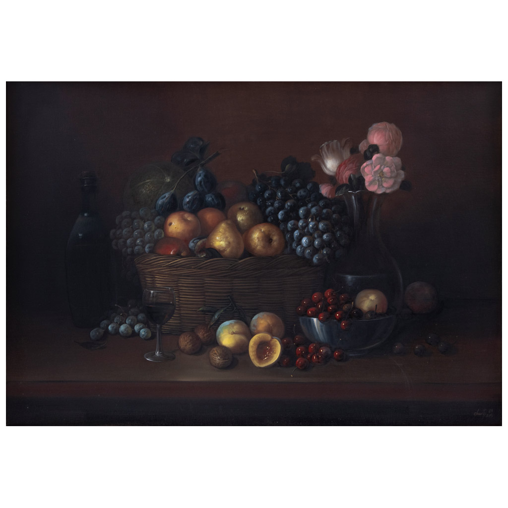 Subasta 1204, Lote # 223 ARMANDO AHUATZI (San Pedro Muñoztla, Tlaxcala, 1950 - ) Bodegón Firmado y fechado 89 Óleo sobre tela 70 x 100.5 cm Estimado $20,000-30,000