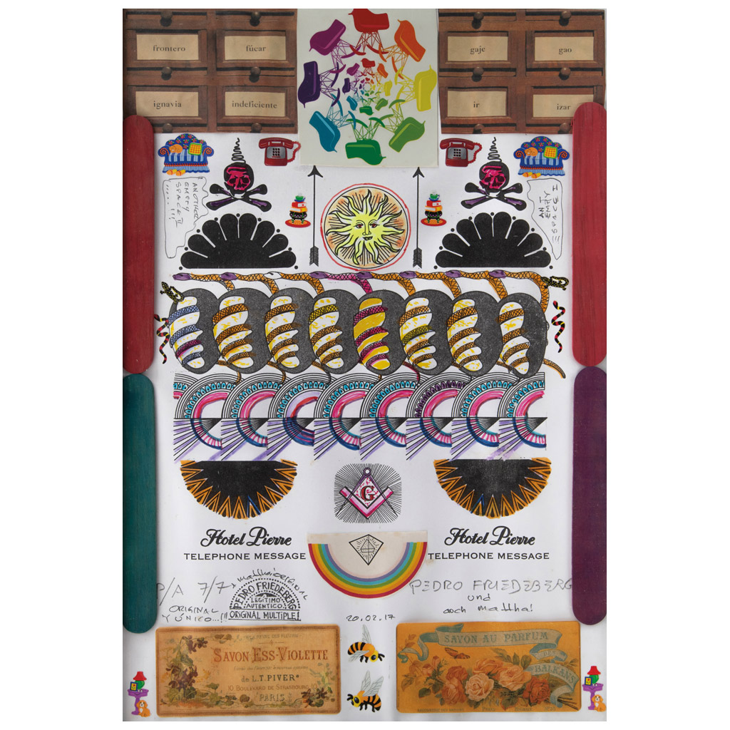 PEDRO FRIEDEBERG y DIEGO MATTHAI (Florencia, Italia, 1936 - ) (Ciudad de México, 1942 - Ciudad de México, 2023) Hotel Pierre Firmado por ambos artistas y fechado 20.02.17 Tinta, collage de impresiones, estampas y palitos de madera sobre papel Procedencia: perteneció a la colección del Arq. Diego Matthai.