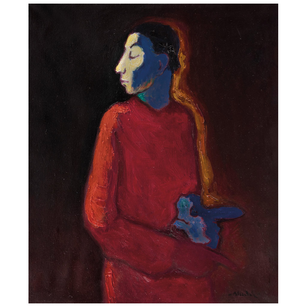 ALFREDO ALCALDE GARCÍA (Chimbote, Perú, 1961 - ) Mimo con máscara Firmado al frente y al reverso Óleo sobre tela Con certificado de autenticidad del artista, noviembre de 2024. Agradecemos al Maestro Alfredo Alcalde por la verificación de autenticidad de esta obra, julio de 2025. 60 x 49.75 cm Estimado $70,000-90,000