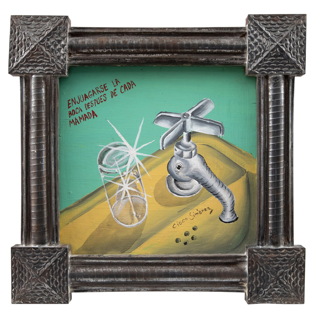 CISCO JIMÉNEZ (Cuernavaca, Morelos, 1969 - ) Enjuagarse la boca después de cada mamada Firmado al frente. Firmado y fechado 88 al reverso Acrílico sobre madera con marco de hojalata Con certificado de autenticidad de Galería OMR, noviembre de 1998. Con etiqueta de Galería OMR. El marco es parte de la obra. 40 x 41 cm Estimado $26,000-36,000