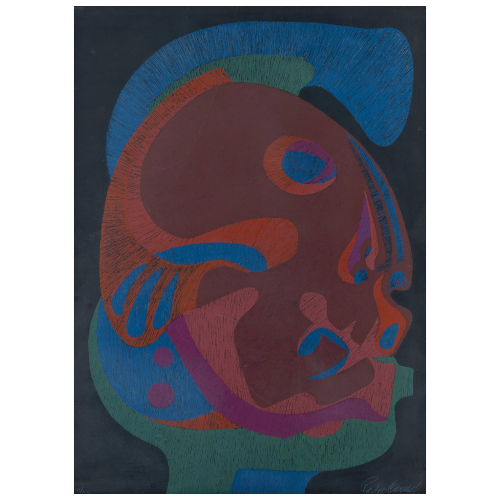 PEDRO CORONEL (Zacatecas, 1923 - Ciudad de México, 1985) Cabeza de Ase Firmada Serigrafía 91 / 100 Con etiqueta de Rafael Matos Casa de Subastas. 75 x 55 cm medidas totales Estimado $16,000-30,000