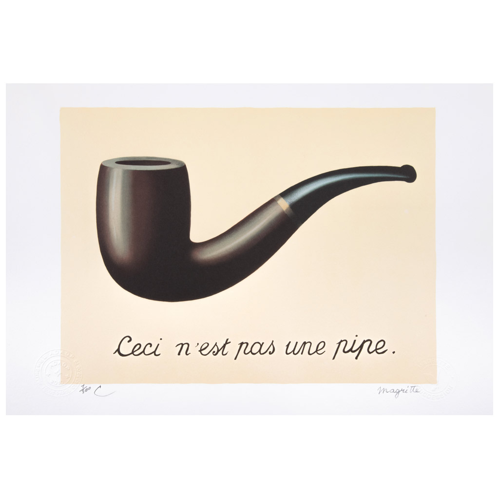 RENÉ MAGRITTE (Bélgica, 1898 - Bélgica, 1967) La trahison des images Firmada con sello Litografía 1 / 30, edición póstuma Con sello de Magritte Succession. Con sello de copyright al reverso. Publicada por la Fundación Magritte. Esta obra litográfica proviene de una pintura una pintura realizada por el artista en 1929, que se encuentra en una colección del Los Angeles County Museum of Arts. 24.5 x 33.5 cm medidas de la imagen 30 x 44 cm medidas del papel Estimado $36,000-50,000