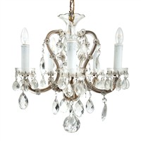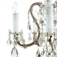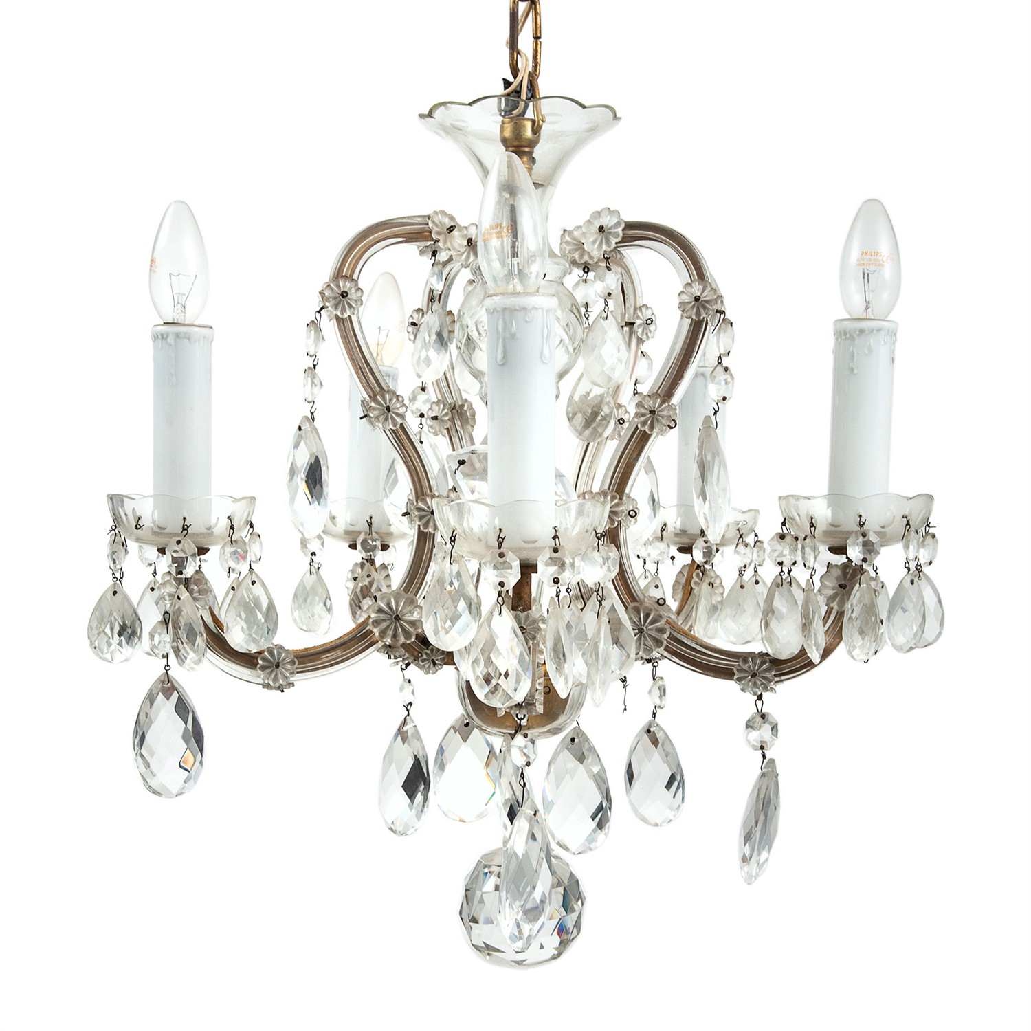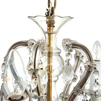 Fuste torneado, 5 brazos curvos, arandelas, almendrones y soporte para techo