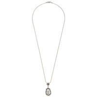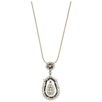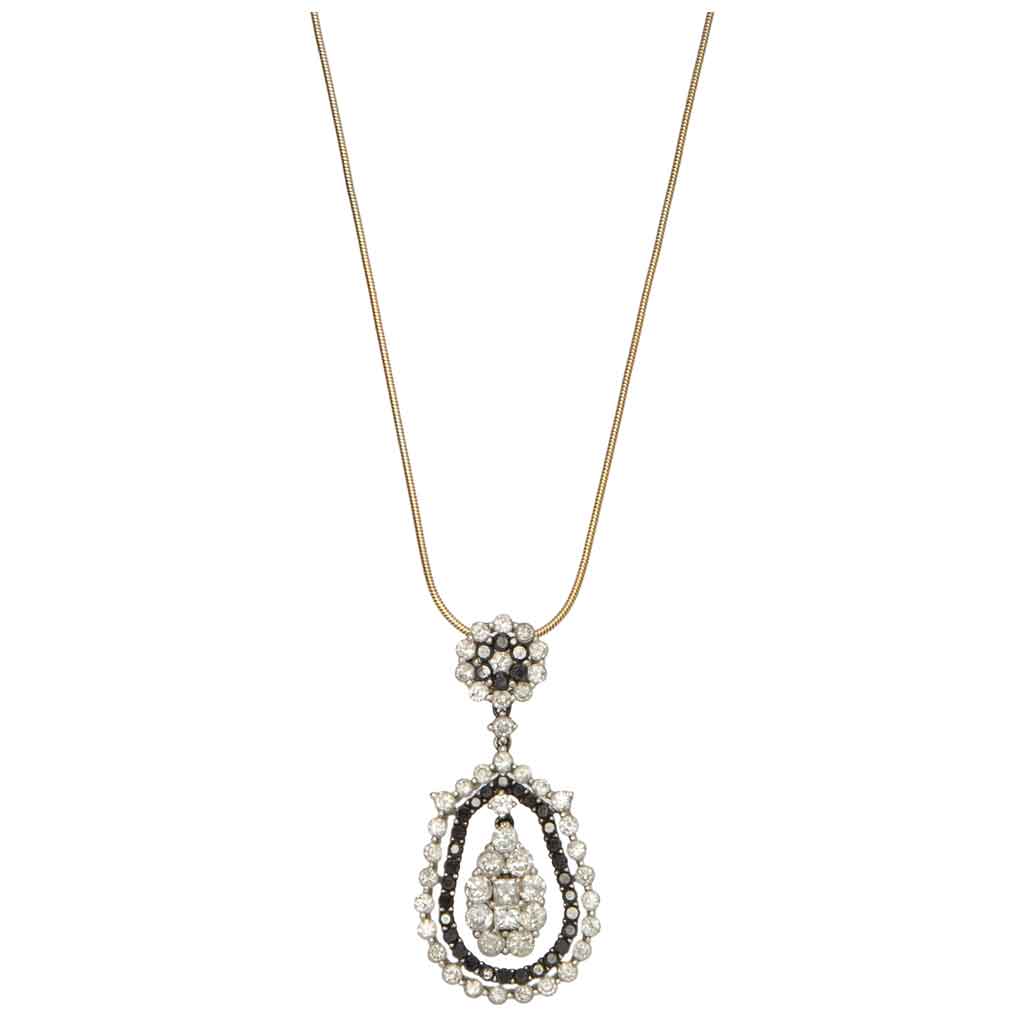 Collar con broche de mosquetón. Largo: 51.5 cm aprox. Pendiente con pasa cadena integrado. Tamaño: 1.6 x 3.3 cm aprox. Peso total: 6.7 g Diamantes negros corte redondo ~0.35 ct Diamantes corte brillante ~1.10 ct