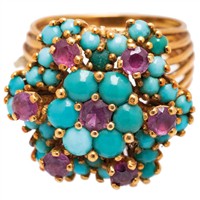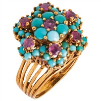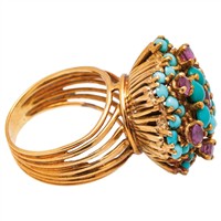 ANILLO CON TURQUESAS Y RUBÍES EN ORO AMARILLO DE 18K