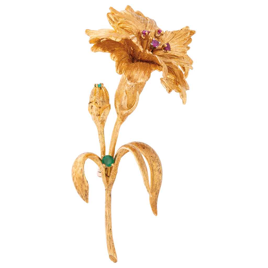 Subasta 1203, Lote # 81 PRENDEDOR CON SIMULANTES EN ORO AMARILLO DE 18K Alfiler y seguro. Peso: 18.4 g. Tamaño: 2.8 x 6.0 cm aprox. Estimado $25,000-30,000