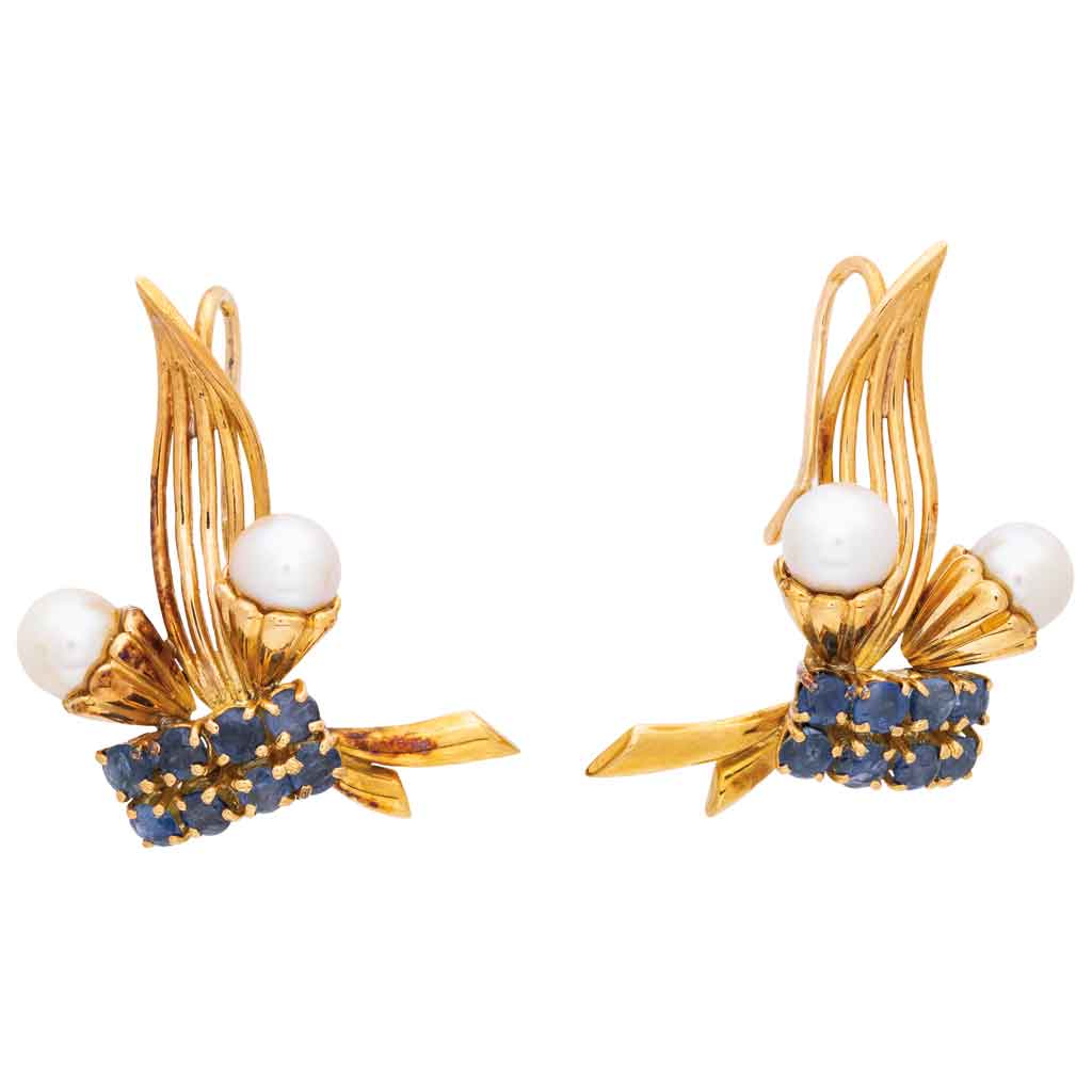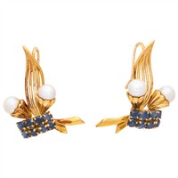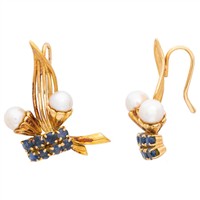 Subasta 1203, Lote # 98 PAR DE ARETES CON PERLAS Y ZAFIROS EN ORO AMARILLO DE 18K Gancho. Peso: 10.2 g. Tamaño: 1.6 x 3.0 cm aprox. Perlas cultivadas semiesféricas color blanco: 5.3 - 5.7 mm aprox. Zafiros corte redondo ~0.60 ct Estimado $13,000-15,000