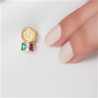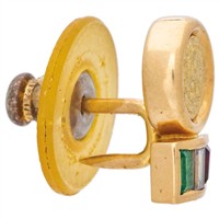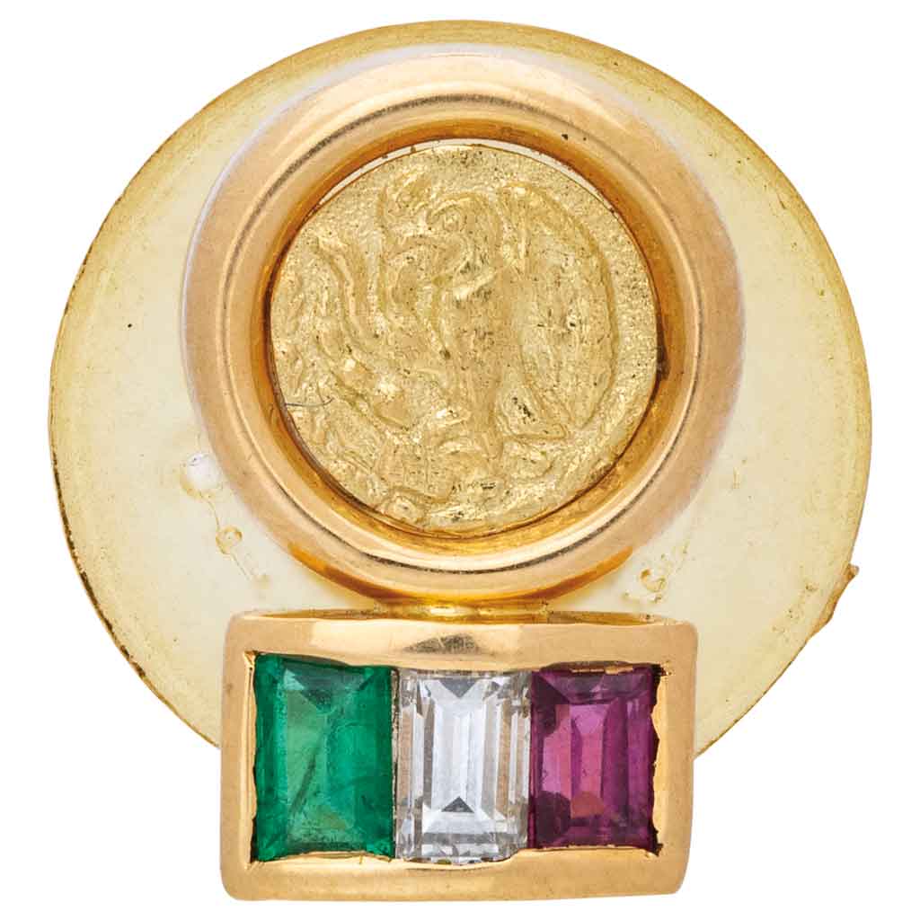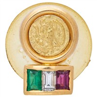 PIN CON ESMERALDA, DIAMANTE Y RUBÍ EN ORO AMARILLO DE 18K