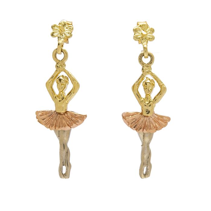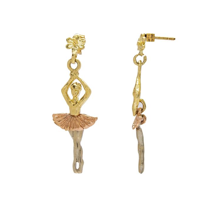 PAR DE ARETES "BAILARINAS DE BALLET" EN ORO AMARILLO DE 14K Poste y contra (vistas rosas y blancas). Tamaño: 3.5 cm x 1.2 cm aprox. Peso: 3.3 g. Estimado $2,500-3,000