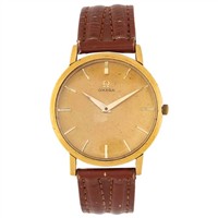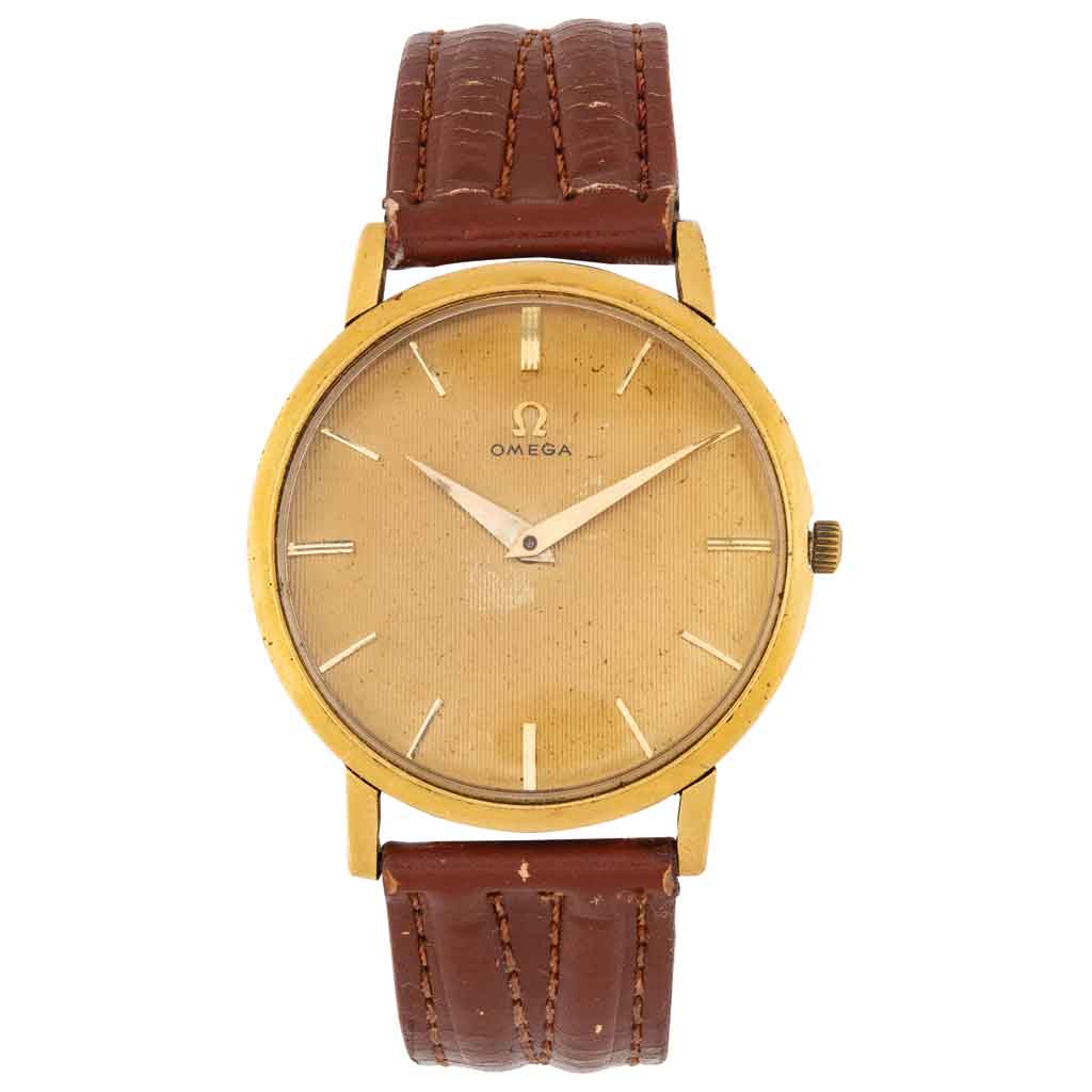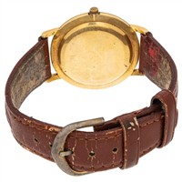 Movimiento: manual (requiere servicio) Calibre: 511 Serie: 383XXX Caja: circular de 33.7 mm en oro amarillo de 18K (corona requiere servicio). Mica (rayada) Carátula: dorada con índices de barras (muestra desgaste, manecillas chuecas) Pulso: correa de piel color café (no original, muestra desgaste, agrietada) con hebilla en chapa (no original)