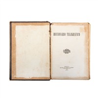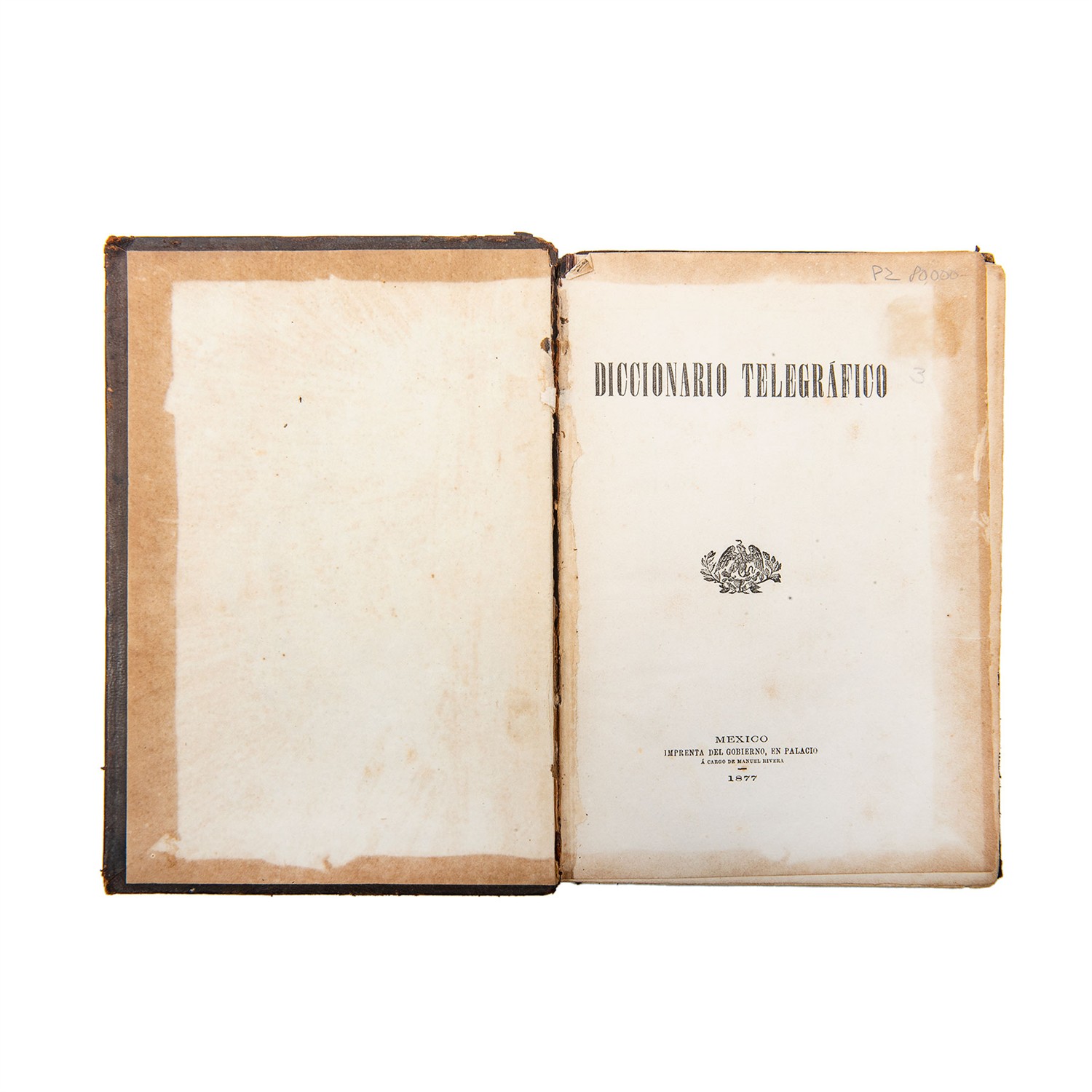 DICCIONARIO TELEGRÁFICO. MÉXICO: IMPRENTA DEL GOBIERNO, 1877. 8o. marquilla, 256 p. Pasta anterior desprendida. Encuadernación deteriorada. Encuadernado en pasta dura, en piel. Estimado $3,000-6,000