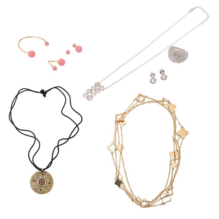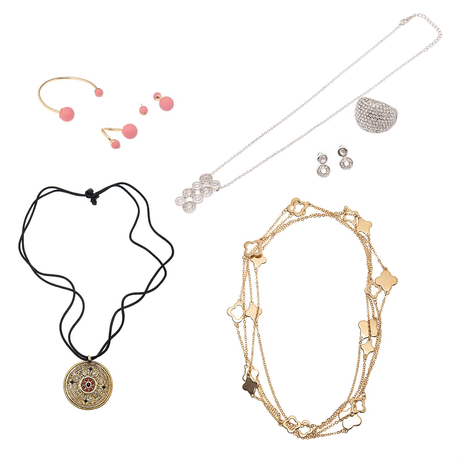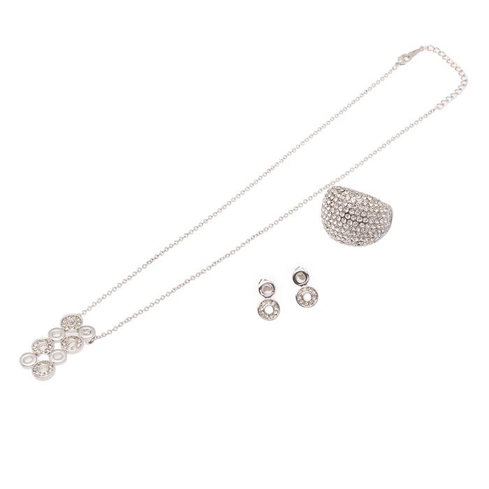 JUEGO DE PAR DE ARETES, ANILLO Y GARGANTILLA CON CIRCONIAS EN METAL BLANCO