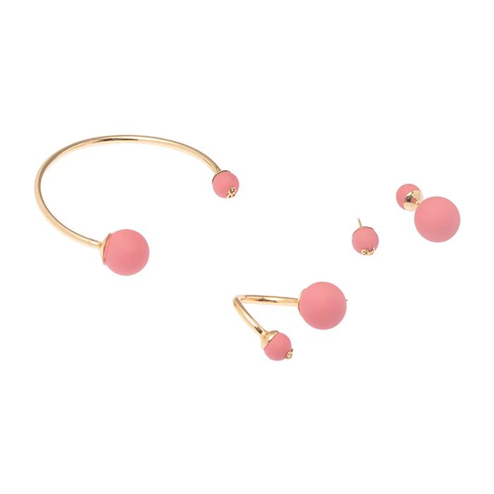 JUEGO DE PAR DE ARETES, ANILLO Y PULSERA CON ACRILICO EN METAL PLATEADO DE LA FIRMA PURIFICACION GARCIA