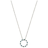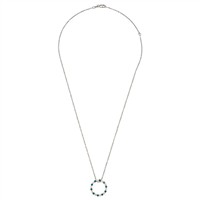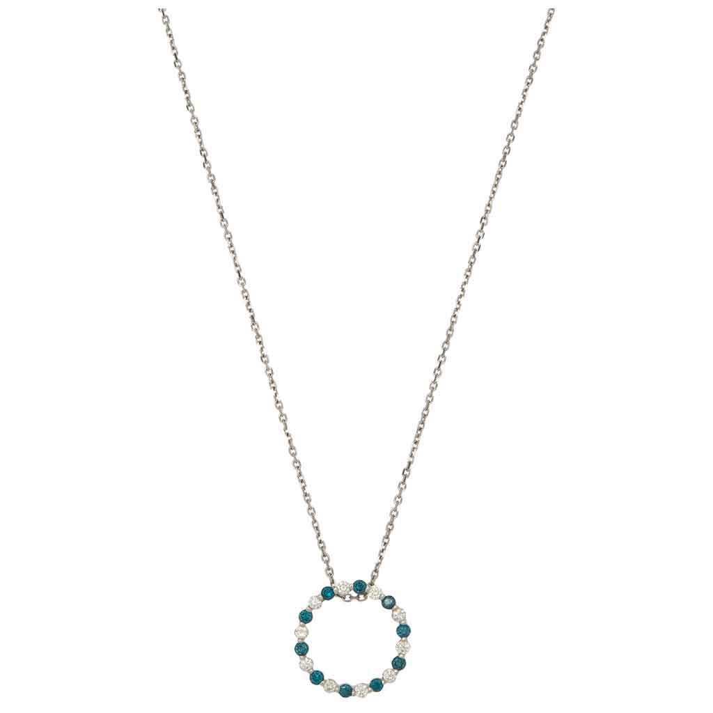 Gargantilla con broche de reasa. Largo: 46.0 cm aprox. Pendiente con pasa cadena integrado. Diámetro: 1.7 cm aprox. Peso total: 4.2 g Diamantes sintéticos color azul corte brillante ~0.35 ct Diamantes corte brillante ~0.30 ct