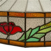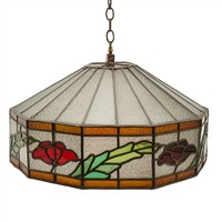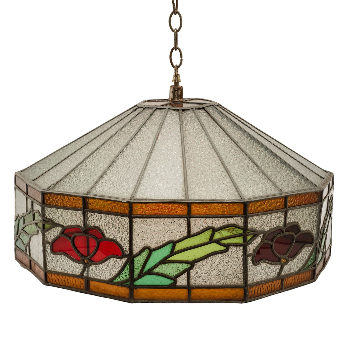 PANTALLA PARA LÁMPARA DE TECHO SIGLO XX Tipo Tiffany Elaborada en vidrio transparente emplomado Diseño decagonal y soporte para techo con cadena Decorado con motivos florales y geométricos Marcas de uso y detalles de conservación 28 cm de altura Estimado $1,800-4,000