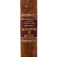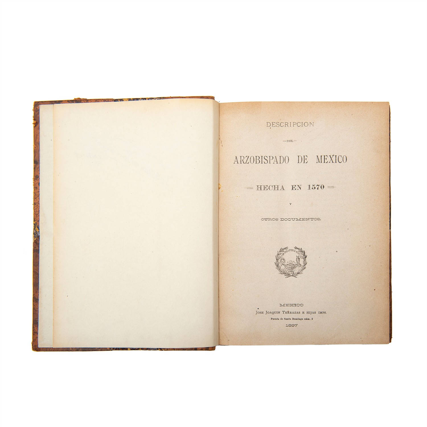 Subasta 1296T, Lote # 10 LUÍS GARCÍA PIMENTEL (CIUDAD DE MÉXICO, 1855 - 1930) DESCRIPCIÓN DEL ARZOBISPADO DE MÉXICO. HECHA EN 1570 Y OTROS DOCUMENTOS MÉXICO: JOSÉ JOAQUÍN TERRAZAS E HIJAS IMPS., 1897 4o. marquilla, 461 + 1 h. "...Contiene noticias importantes sobre el número y condiciones de los ministros, sus trabajos para propagar el evangelio, una escrupulosa estadística de los pueblos y personas que tenían a su cargo, los idiomas que se hablaban, los libros de texto que usaban para el catequismo, los manuales de que se servían para la administración de los sacramentos, las mejoras que proponían, la industria y el modo de ser de los indios y la fundición de muchas iglesias…". Encuadernado en pasta dura, lomo y puntas en piel Palau: 70976. "De un manuscrito perteneciente a D. Joaquín García Icazbalceta, publicado por su hijo D. Luis García Pimentel" Estimado $5,000-8,000