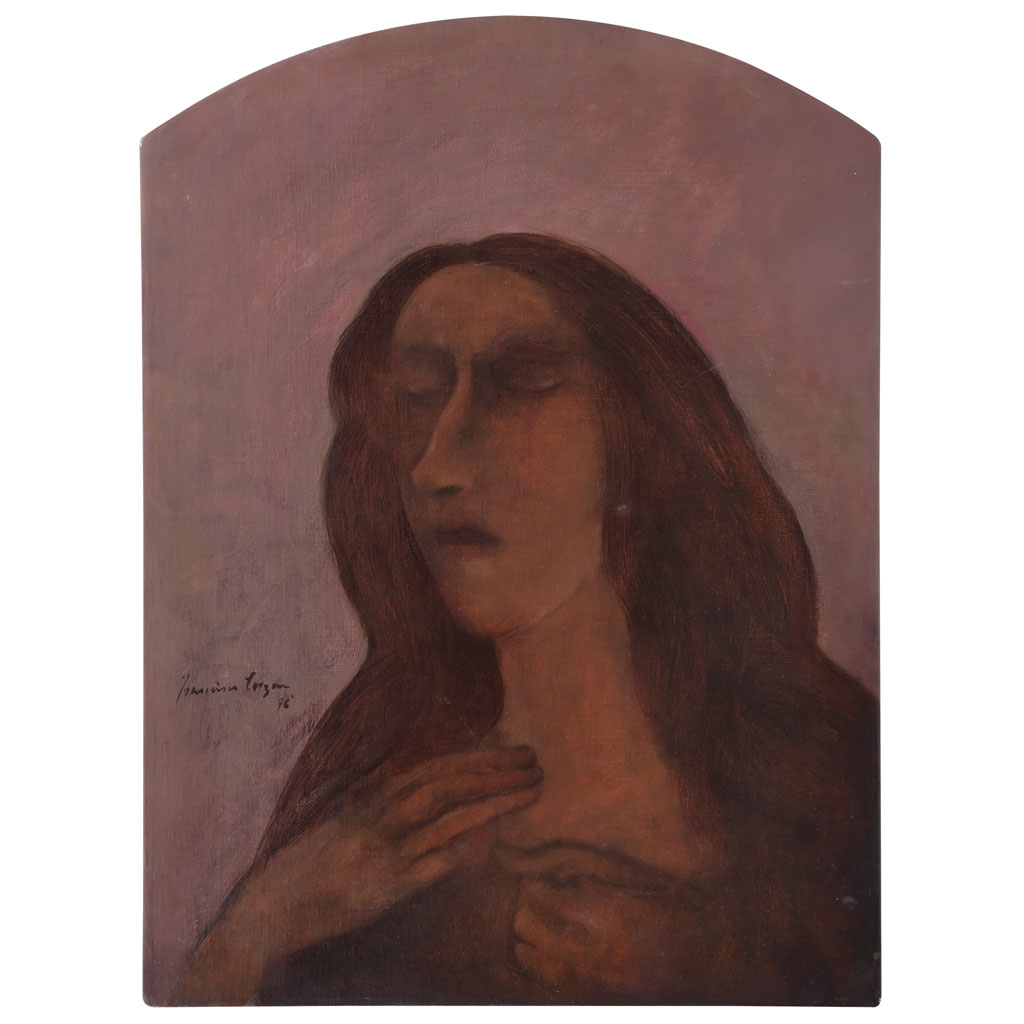 Subasta 1296T, Lote # 102 FRANCISCO CORZAS (Ciudad de México, 1936 - Ciudad de México, 1983) Orante Firmado y fechado 76 al frente y al reverso Óleo sobre tela Presenta mínimos detalles de conservación. A diferencia de algunos de sus contemporáneos que trabajaron a través de la plataforma nacionalista, Francisco Corzas se remitió a referencias de la historia del arte para nutrir sus propias piezas, tal es el caso del simbolismo tardío como Odilon Redon, o la obra de Pablo Picasso en su etapa más temprana en las que podemos encontrar similitudes tanto en la paleta de color como en las temáticas envolventes, por otro lado, Edvard Munch, con quien congenió en plasmar situaciones emocionales a las que el humano es susceptible. "Francisco Corzas es uno de esos pintores que, más allá de las coincidencias con escuelas o tendencias pictóricas, se distingue por la visión íntima de aquellos seres y ambientes peculiares que habitan un mundo oscuro y enigmático". Sealtiel Alatriste. Fuentes consultadas: SAAVEDRA, Manola. Francisco Corzas. México. Fondo Editorial de la Plástica Mexicana - PEMEX - 1987, pp. 7-15 y DEL CONDE, Teresa, et al. Francisco Corzas. México. Grupo Financiero Bital. 2001, pp. 116-185. Los estimados de este lote son de recuperación y no corresponden al valor real de la obra. 80 x 60 cm Estimado $72,000-150,000