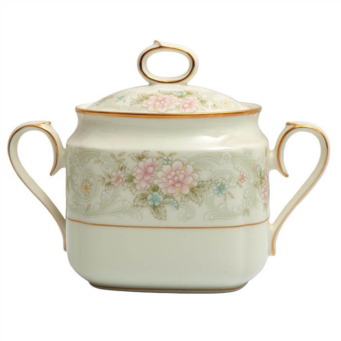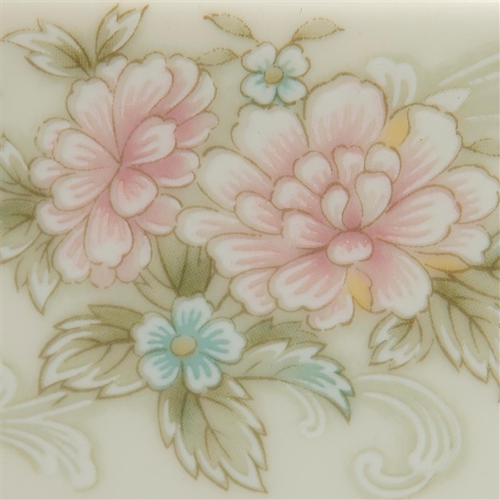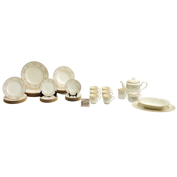 Consta de: tetera, azucarera, cremera, 2 platos de servicio, 6 tazas, 6 platos trinche, 6 platos soperos, 6 platos de ensalada, 6 platos pan y 6 platos terno