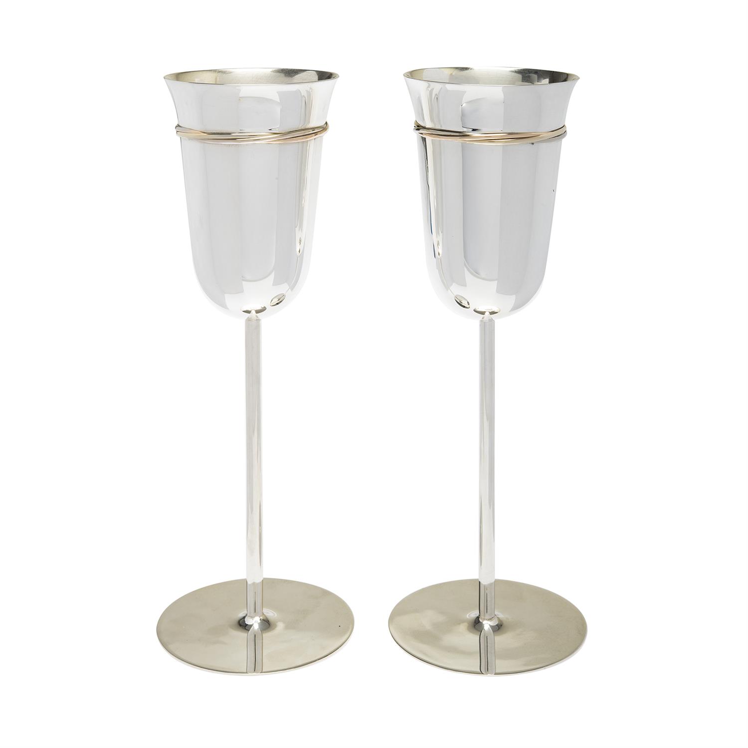 Subasta 1297T, Lote # 260 DOS COPAS PARA VINO "TIPO TRINITY BAND" EN PLATA .925 Y VERMEIL Mexico. Peso: 330.4 g. Medidas: Cáliz: 6.3 cm aprox, Tallo: 20.7 cm aprox y Base: 7.3 cm aprox. Numero de serie: 303XXX Accesorios: estuche. Reseña: Las copas de plata se han usado durante siglos para el vino, y no menos importante el tomarla en estas finas copas. La plata por ser metal noble y fino es bastante neutra, por eso la usamos para utensilios de comer, para joyeria, y hasta para catar vino se usa tradicionalmente, aunque principalmente por el coste se han dejado de ver en gran cantidad de sitios, por ello si vas a brindar, no pasa nada para un trago rápido en estas finas y estilizadas copas. Estimado $14,000-20,000
