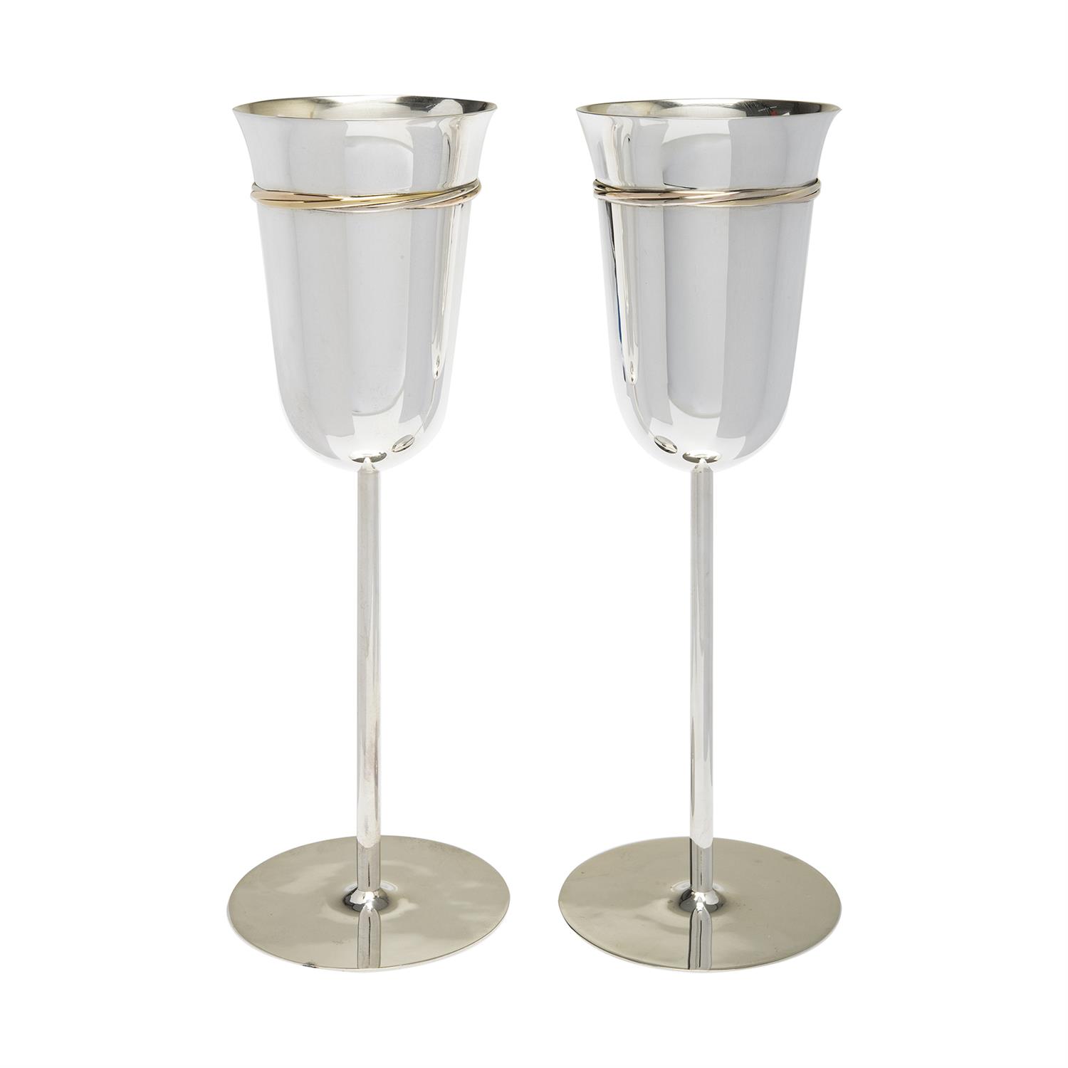 Subasta 1297T, Lote # 261 DOS COPAS PARA VINO "TIPO TRINITY BAND" EN PLATA .925 Y VERMEIL Mexico. Peso: 332.7 g. Medidas: Cáliz: 6.3 cm aprox, Tallo: 20.7 cm aprox y Base: 7.3 cm aprox. Numero de serie: 303XXX Accesorios: estuche. Reseña: Las copas de plata se han usado durante siglos para el vino, y no menos importante el tomarla en estas finas copas. La plata por ser metal noble y fino es bastante neutra, por eso la usamos para utensilios de comer, para joyeria, y hasta para catar vino se usa tradicionalmente, aunque principalmente por el coste se han dejado de ver en gran cantidad de sitios, por ello si vas a brindar, no pasa nada para un trago rápido en estas finas y estilizadas copas. Estimado $14,000-20,000