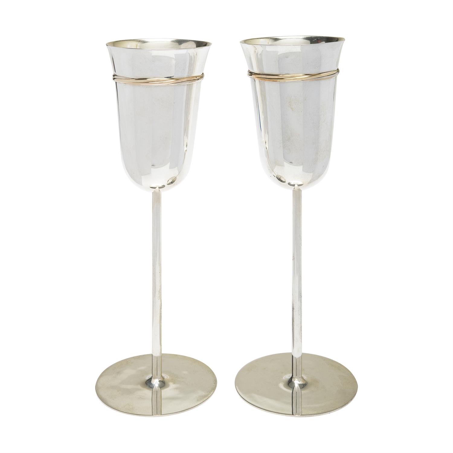 Subasta 1297T, Lote # 262 DOS COPAS PARA VINO "TIPO TRINITY BAND" EN PLATA .925 Y VERMEIL Mexico. Peso: 326.9 g. Medidas: Cáliz: 6.3 cm aprox, Tallo: 20.7 cm aprox y Base: 7.3 cm aprox. Numero de serie: 303XXX Accesorios: estuche. Reseña: Las copas de plata se han usado durante siglos para el vino, y no menos importante el tomarla en estas finas copas. La plata por ser metal noble y fino es bastante neutra, por eso la usamos para utensilios de comer, para joyeria, y hasta para catar vino se usa tradicionalmente, aunque principalmente por el coste se han dejado de ver en gran cantidad de sitios, por ello si vas a brindar, no pasa nada para un trago rápido en estas finas y estilizadas copas. Estimado $14,000-20,000