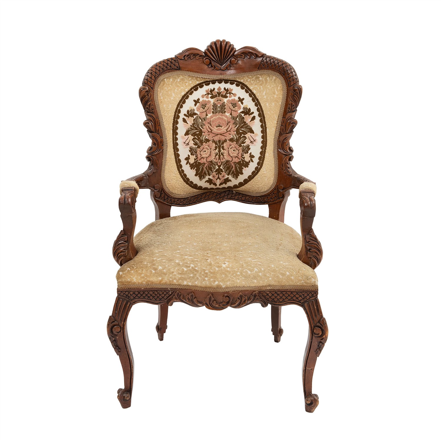 Respaldo y asiento acojinado, tapicería textil color beige y soportes cabriolé