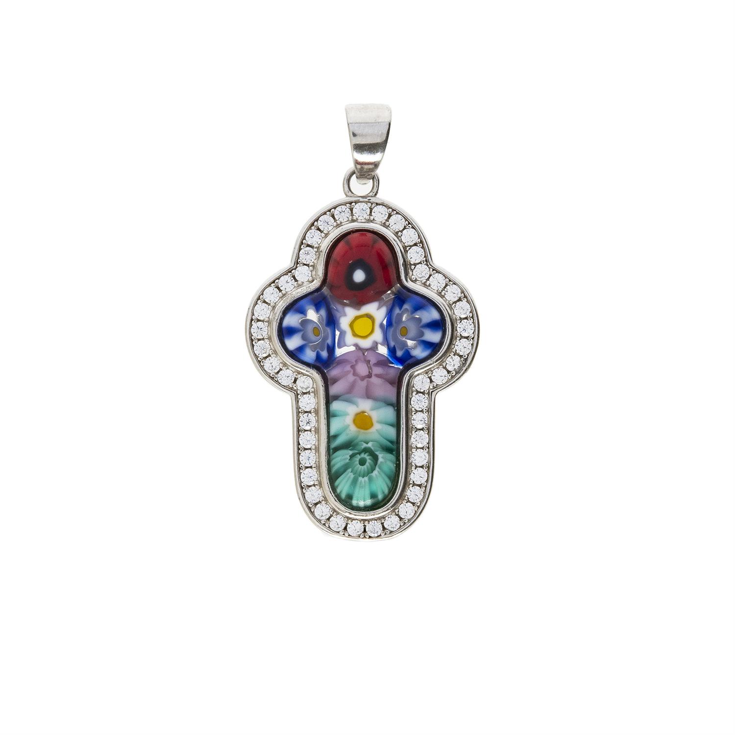 CRUZ CON CRISTAL MURANO MULTICOLOR Y CIRCONIAS EN PLATA .925 CON RODIO Broche pasa cadena abatible. Tamaño: 3.3 cm x 1.8 cm aprox. Peso: 5.4 g. Estimado $1,000-1,500