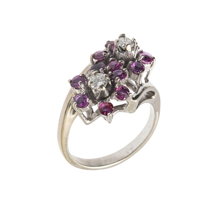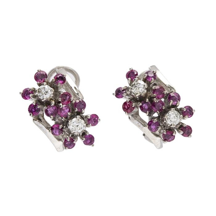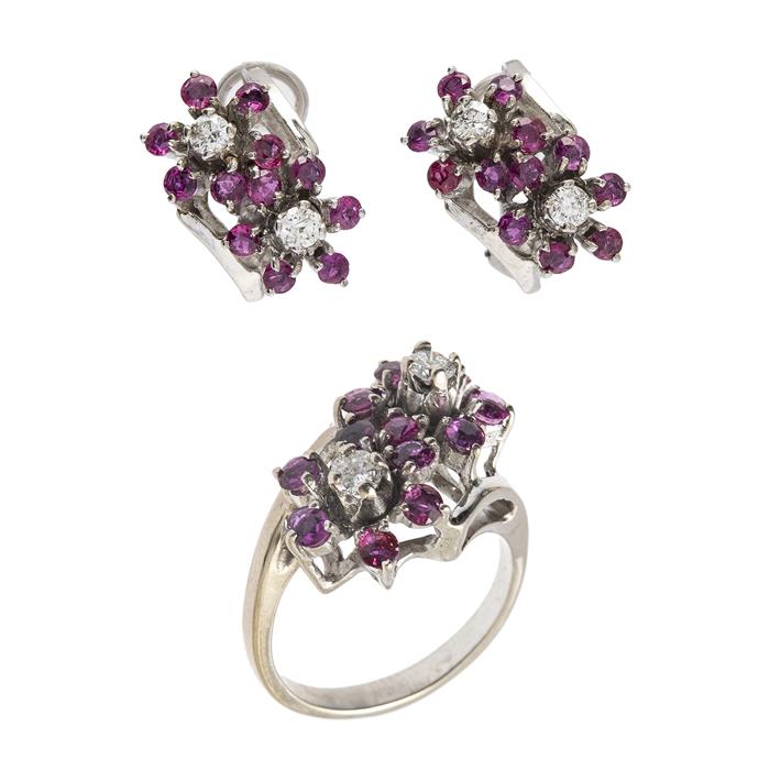 JUEGO DE PAR DE ARETES Y ANILLO CON RUBIES Y DIAMANTES EN PLATA PALADIO