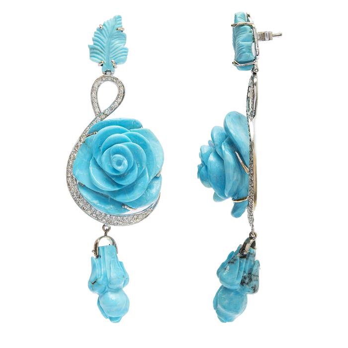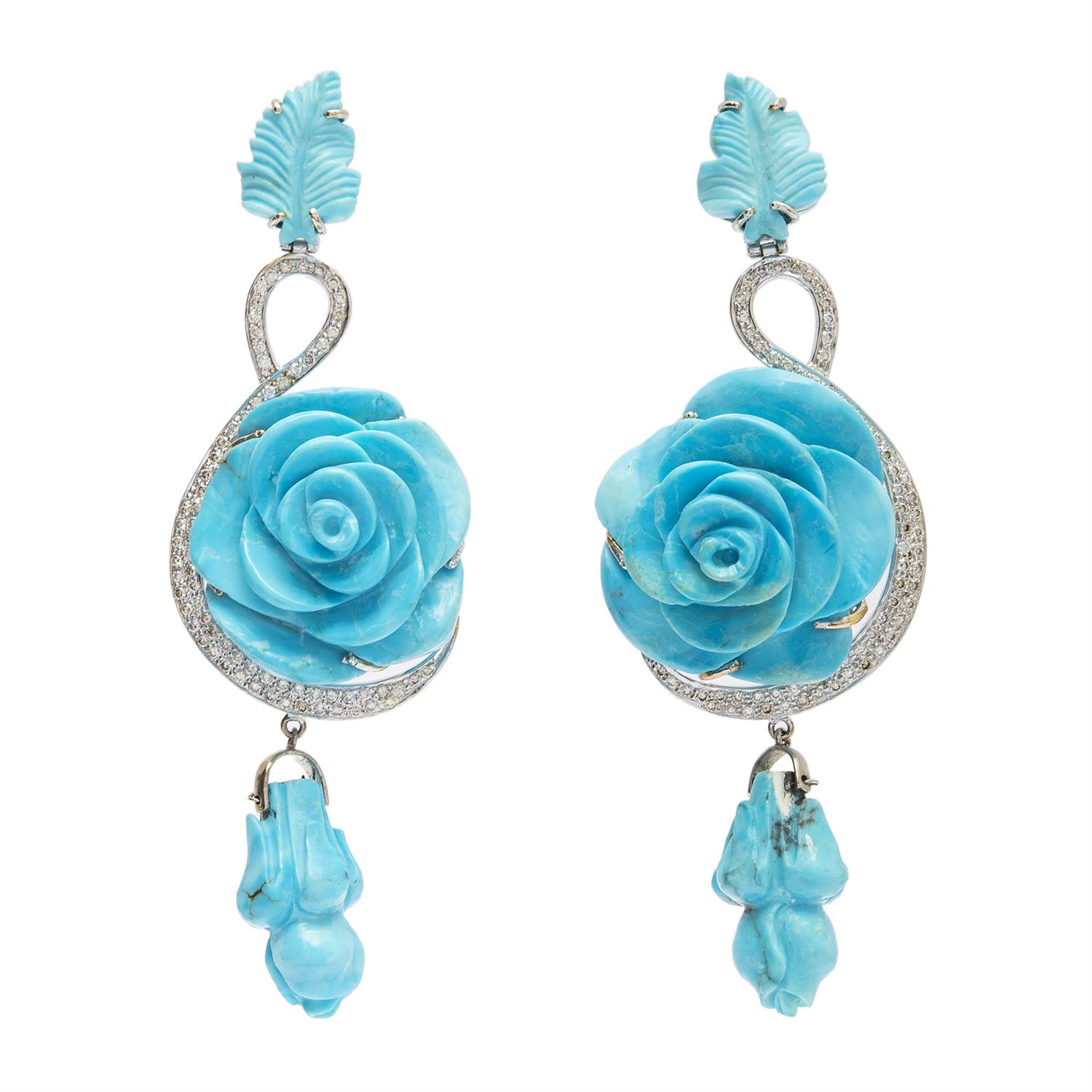 Subasta 1297T, Lote # 222 PAR DE ARETES CON TURQUESAS Y DIAMANTES EN ORO BLANCO DE 18K Poste y contra. Tamaño: 8.0 cm x 2.5 cm aprox. Peso: 32.5 gramos. Estimado $9,500-11,000