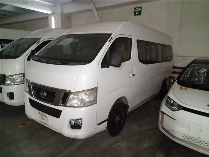 Eco. U50803; Camioneta de pasajeros, Urvan; Marca: Nissan; Modelo: 2014; Serie: JN1BE6DS6E9002902; Ubicación: Tecamac; Observaciones: Unidad sin prueba de arranque, por lo que no se garantiza su funcionamiento, sin llave, batería dañada, transmisión sin probar, interiores maltratados, vestiduras rotas, chasis con corrosión, carrocería con golpes ligeros, fascias dañadas, calaveras rotas, llantas lisas y dañadas.;