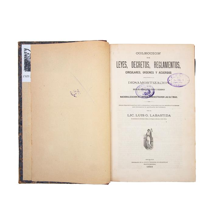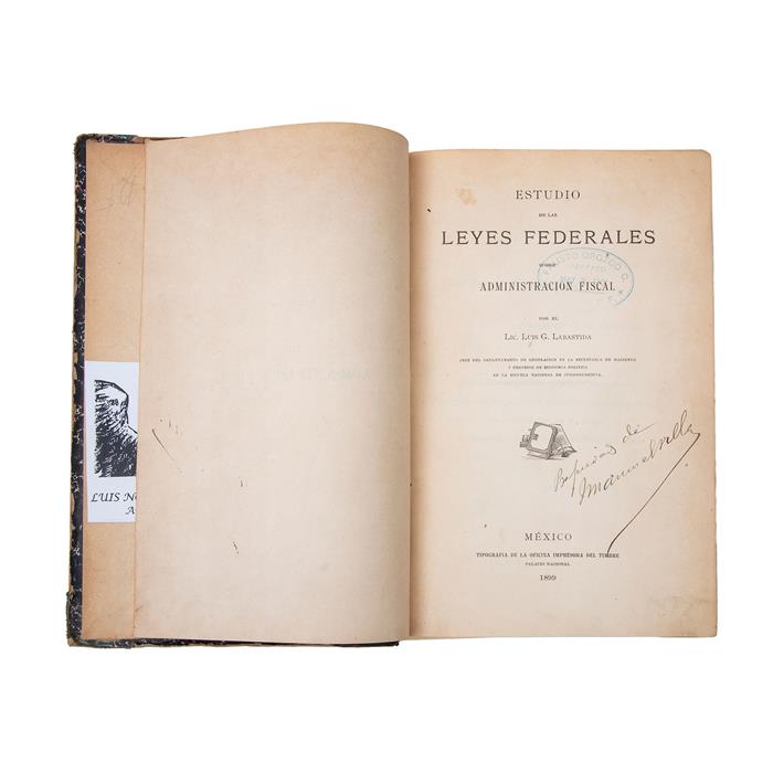 Subasta 1297T, Lote # 5 Colección de legislación Mexicana, Porfiriato. a) Labastida, Luis G. Colección de leyes, decretos, reglamentos, circulares, órdenes y acuerdos relativos a la desamortización de los bienes de corporaciones civiles y religiosas. México, 1893. b) Manresa y Navarro, José María. Ley de enjuiciamiento Civil comentada y explicada. México, 1874. c) Labastida, Luis G. Estudio de las leyes federales sobre administración fiscal. México, 1899. d) Pallares, Jacinto. Historia del derecho Mexicano. México, 1904. Total de Piezas: 4. Estimado $1,800-8,000